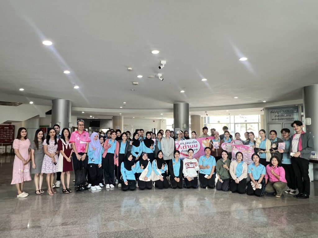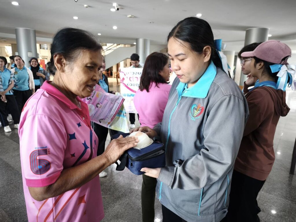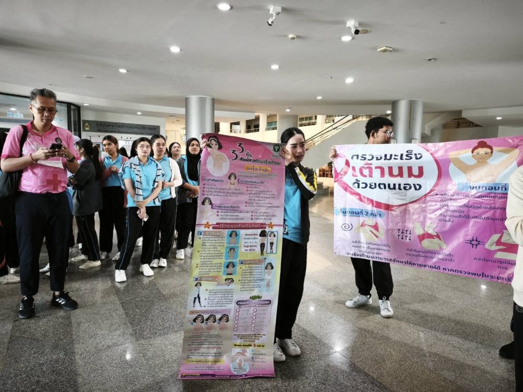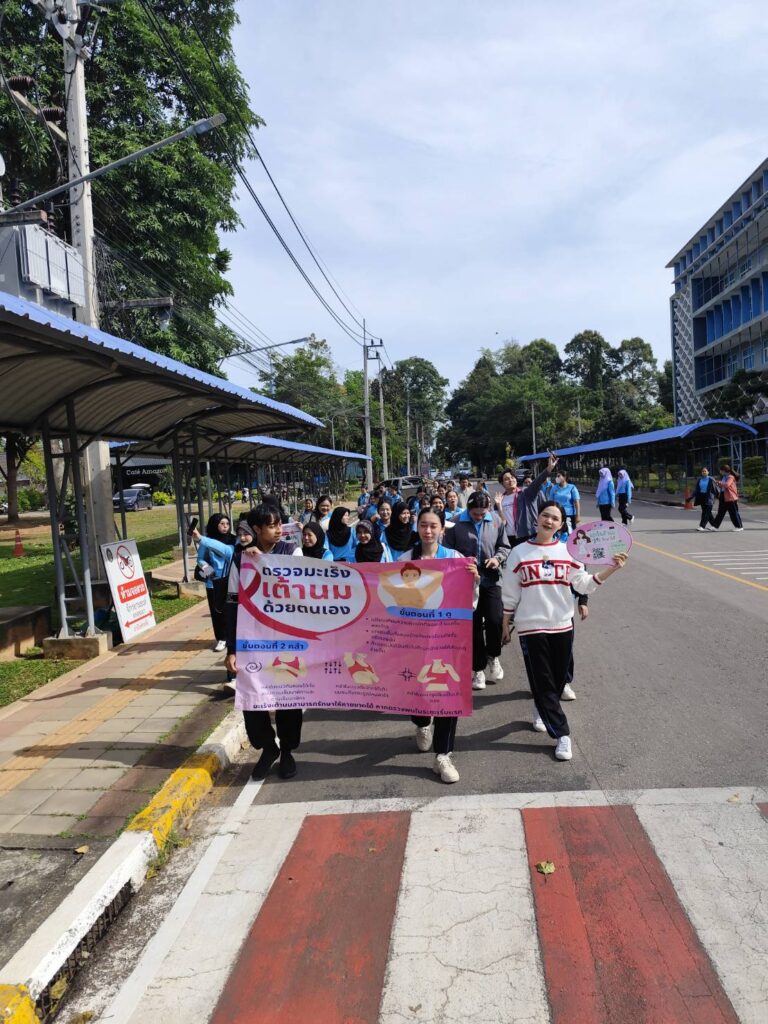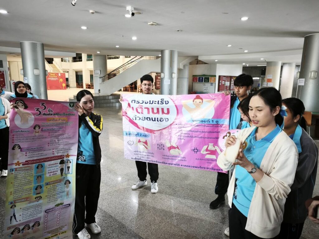 นักศึกษาชมรมถันยรักษ์ มหาวิทยาลัยราชภัฏสุราษฎร์ธานี (มรส.) เดินหน้าขับเคลื่อนภารกิจส่งเสริมสุขภาพตามยุทธศาสตร์ “มหาวิทยาลัยเพื่อท้องถิ่น” จัดโครงการ “ภารกิจพิชิตมะเร็งเต้านม วัยรุ่นยุคใหม่ ยุค Society 5.0 ใส่ใจเต้า” ประจำปี 2568-2569 บูรณาการรายวิชาร่วมรณรงค์สร้างความรู้พร้อมกระตุ้นกลุ่มเป้าหมายตรวจเต้านมด้วยตนเองและบันทึกผ่านโปรแกรม Breast Self-Examination:BSE Application ให้การดูแลสุขภาพเป็นเรื่องใกล้ตัว ง่ายต่อการติดตามผล สร้างความตระหนักรู้ผ่านบทบาทเทคโนโลยี เมื่อวันที่ 7 ตุลาคม 2568 ณ หน่วยงานต่างๆ ภายในมหาวิทยาลัยราชภัฏสุราษฎร์ธานี