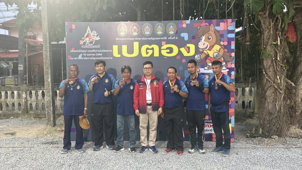 ทัพนักกีฬาบุคลากรมหาวิทยาลัยราชภัฏสุราษฎร์ธานี (มรส.) โชว์ฟอร์มเยี่ยม ประเดิมเหรียญรางวัลแรกในการแข่งขันกีฬาบุคลากรมหาวิทยาลัยราชภัฏเขตภาคใต้ ครั้งที่ 8 “นคราปัญญาเกมส์” จากกีฬาเปตองประเภทชายคู่ ท่ามกลางบรรยากาศการชิงชัยที่เข้มข้น