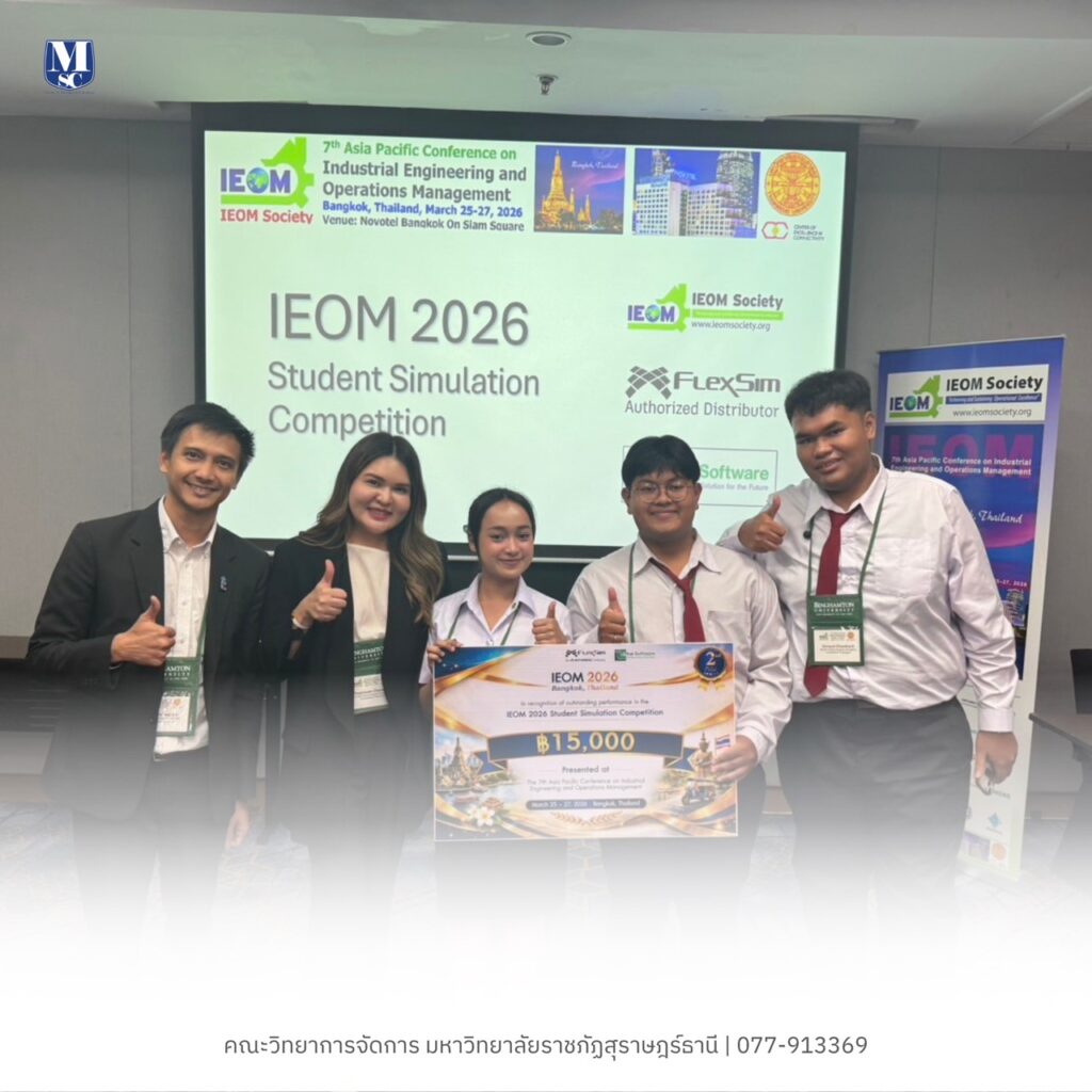 ขอแสดงความยินดีกับ นักศึกษาสาขาวิชาการจัดการโลจิสติกส์ คณะวิทยาการจัดการ คว้ารางวัลรองชนะเลิศอันดับ 1 (Second Prize) พร้อมรับเงินรางวัล 15,000 บาท ในการเข้าร่วมประกวดแข่งขันตอบปัญหาการจำลองสถานการณ์ระดับนานาชาติ IEOM 2026 Student Simulation Competition ซึ่งจัดขึ้นเมื่อวันที่ 25-27 มีนาคม 2569 ในงานประชุมวิชาการนานาชาติ ณ โรงแรมโนโวเทล กรุงเทพฯ สยามสแควร์