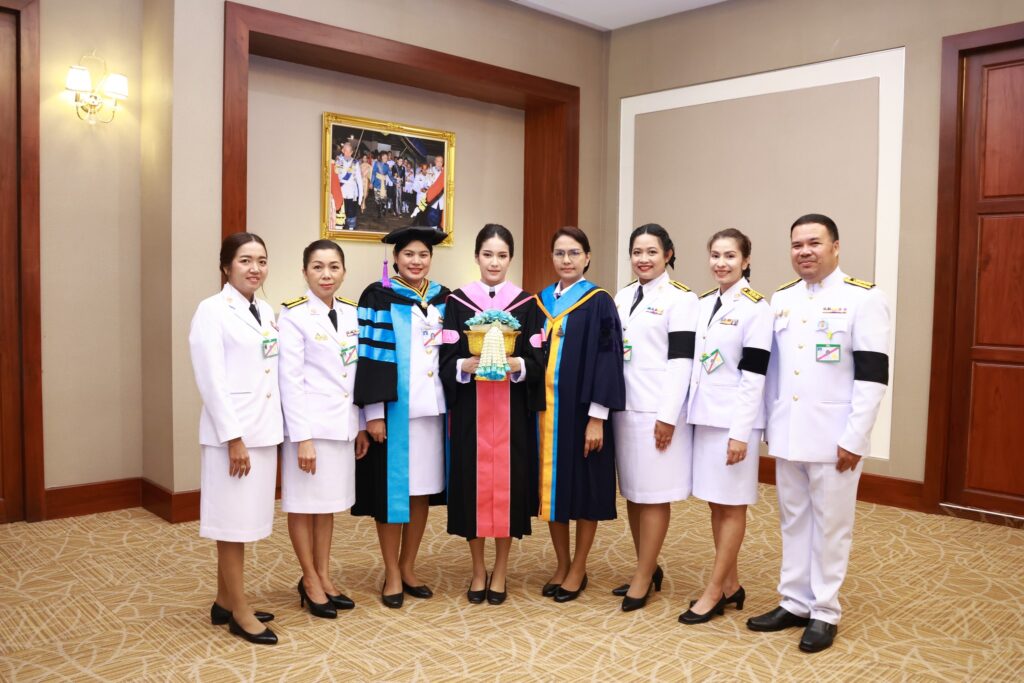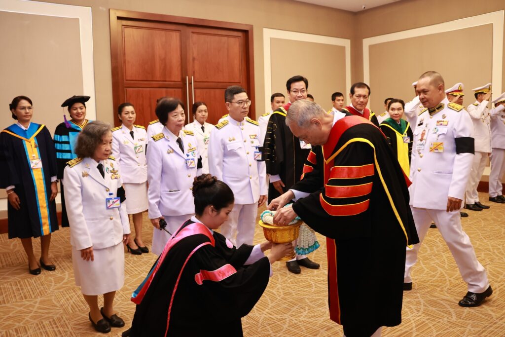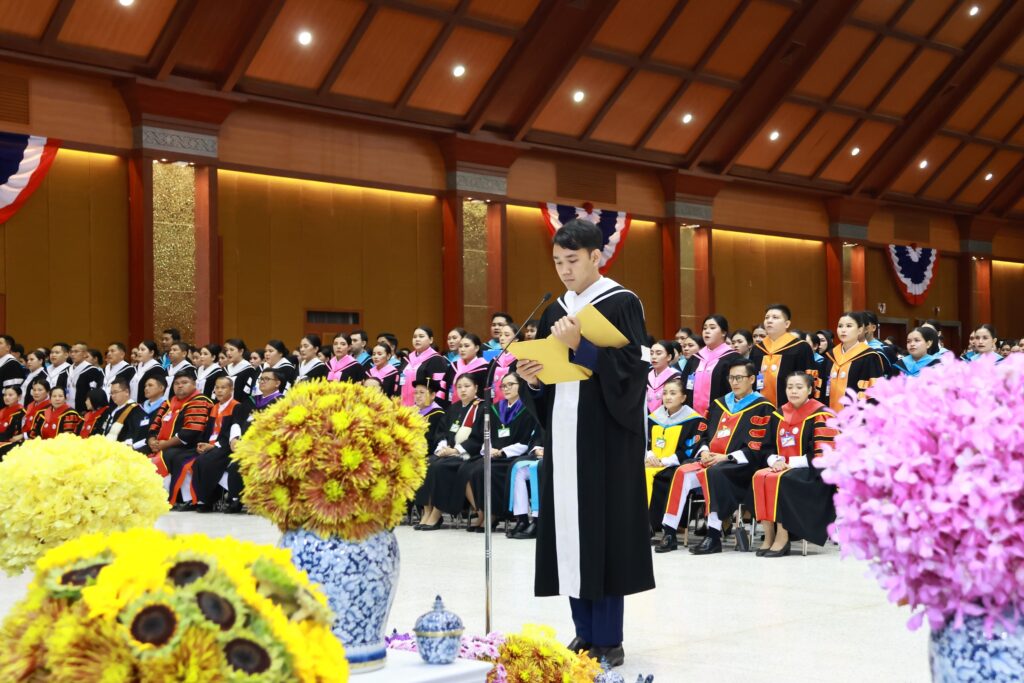 ในพิธีอันทรงเกียรตินี้ นายวิชัย ศรีขวัญ นายกสภามหาวิทยาลัยราชภัฏสุราษฎร์ธานี ได้กล่าวรายงาน ผู้ช่วยศาสตราจารย์ ดร.วัฒนา รัตนพรหม อธิการบดีมหาวิทยาลัยราชภัฏ สุราษฎร์ธานี นำเบิกตัวบัณฑิตเข้ารับพระราชทานปริญญาบัตร เพื่อความเป็นสิริมงคล และภาคภูมิใจแก่บัณฑิตและครอบครัว