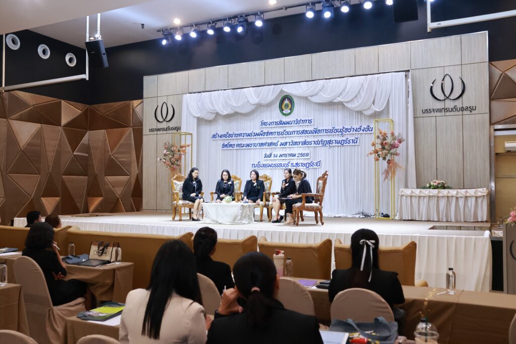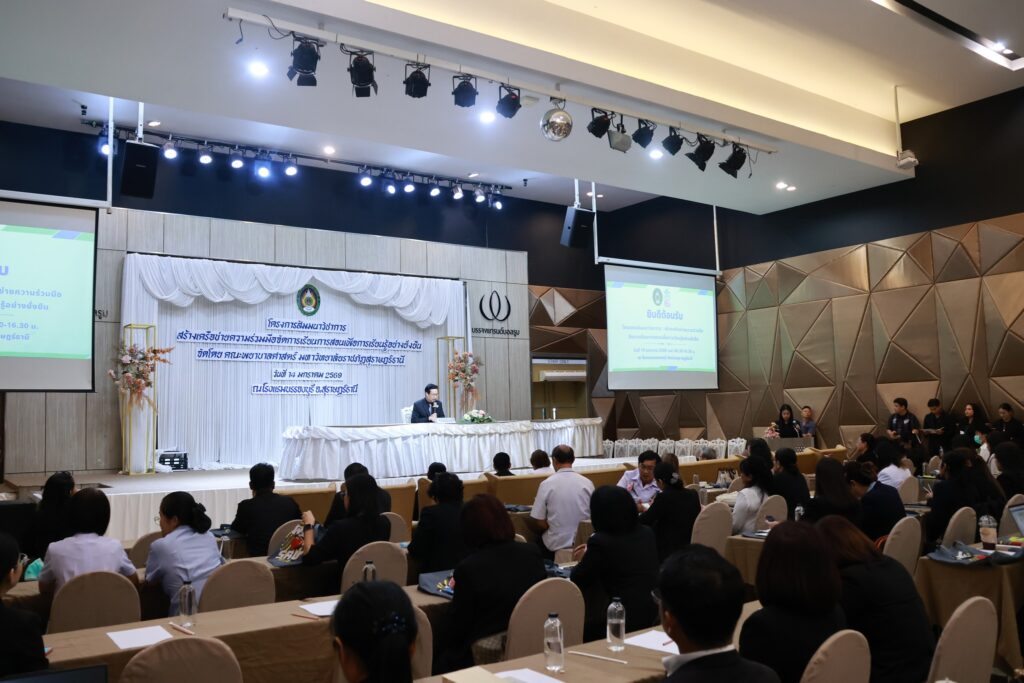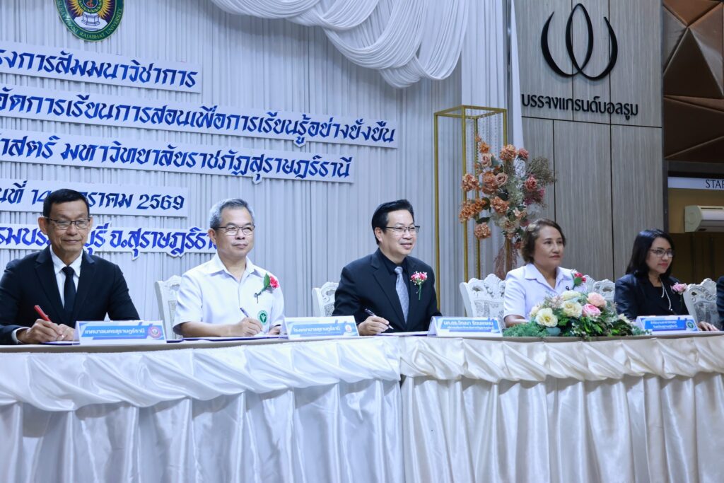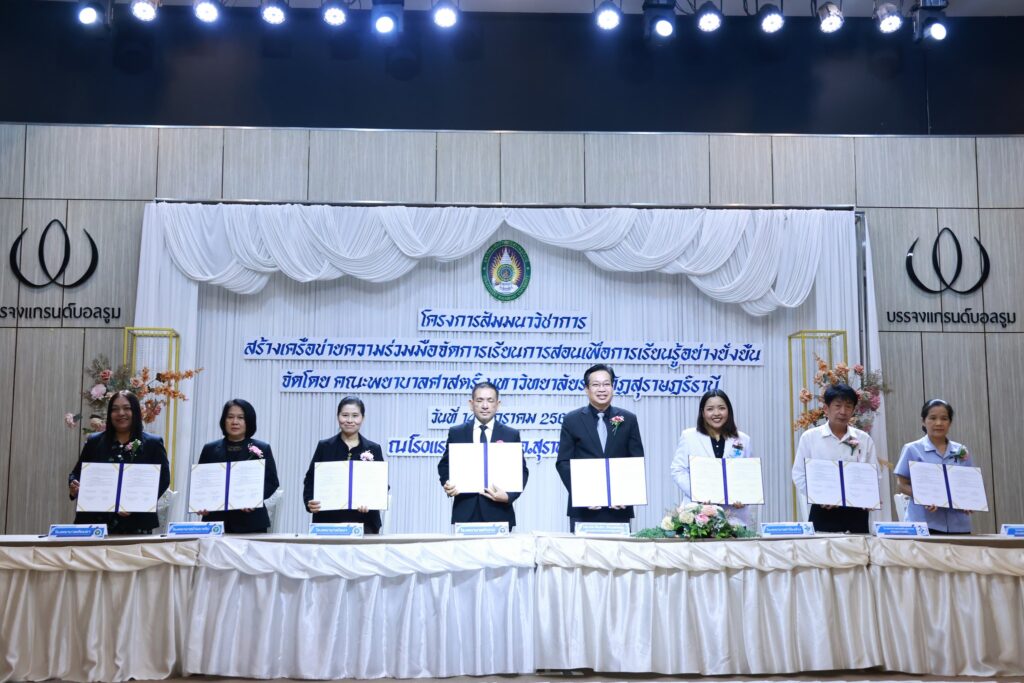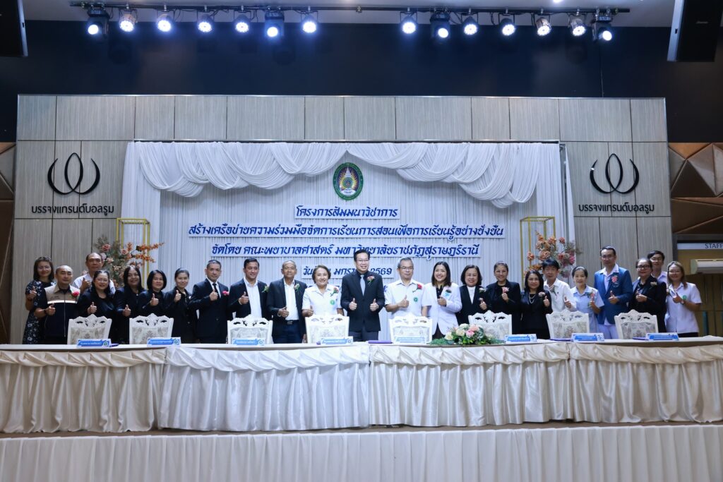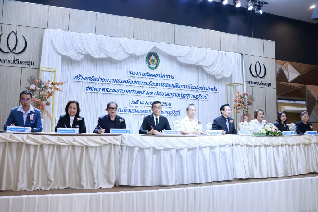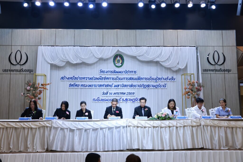 คณะพยาบาลศาสตร์ มหาวิทยาลัยราชภัฏสุราษฎร์ธานี (มรส.) จัดโครงการสัมมนาวิชาการ “สร้างเครือข่ายความร่วมมือจัดการเรียนการสอนเพื่อการเรียนรู้อย่างยั่งยืน” ผนึกกำลังแหล่งฝึกภาคปฏิบัติภาคใต้ สร้างเครือข่ายความร่วมมือพัฒนานักศึกษาพยาบาลสู่บุคลากรทางการพยาบาล พร้อมเรียนรู้ เข้าใจทฤษฎี ปฏิบัติเป็น ดูแลผู้ป่วยได้จริงทุกสถานการณ์ อย่างมีคุณภาพพร้อมรับใช้สังคม โดยได้รับเกียรติจาก ผู้ช่วยศาสตราจารย์ ดร.วัฒนา รัตนพรหม อธิการบดี มรส. เป็นประธานลงนามความร่วมมือ (MOU) สร้างเครือข่ายการจัดการเรียนการสอนเพื่อการเรียนรู้อย่างยั่งยืน ร่วมกับแหล่งฝึกภาคปฏิบัติ ณ โรงพยาบาลประจำจังหวัดในภาคใต้ โรงพยาบาลส่งเสริมสุขภาพตำบล ทั้งในสังกัดองค์การบริหารส่วนจังหวัด สำนักงานสาธารณสุขอำเภอ และสำนักงานสาธารณสุขจังหวัด ศูนย์บริการสาธารณสุขในสังกัดเทศบาลนครสุราษฎร์ธานี ร่วม 20 แห่ง