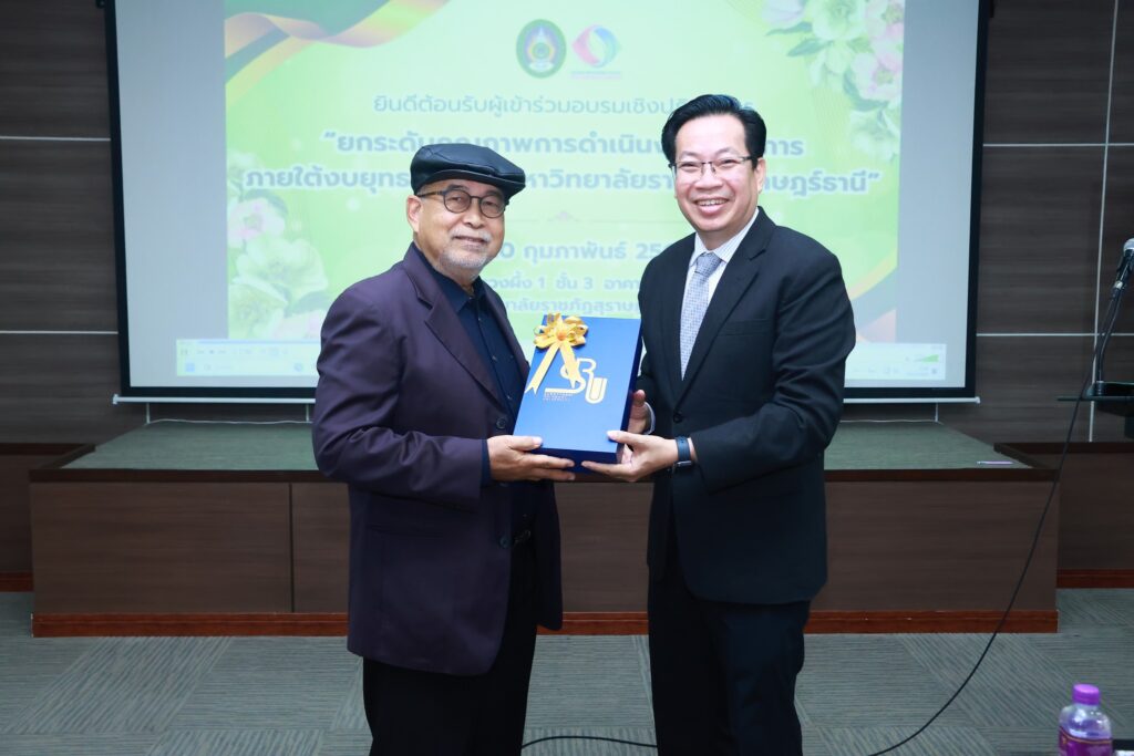 สถาบันวิจัยและพัฒนา มหาวิทยาลัยราชภัฏสุราษฎร์ธานี จัดอบรมเชิงปฏิบัติการยกระดับคุณภาพการดำเนินงานโครงการภายใต้งบยุทธศาสตร์ เพื่อการพัฒนาท้องถิ่น ประจำปีงบประมาณ 2569 มุ่งยกระดับงานวิจัย เชื่อมโยงพื้นที่ สร้างผลลัพธ์เชิงประจักษ์ เสริมองค์ความรู้ วิเคราะห์ผลตอบแทนทางสังคม เปิดเวทีแลกเปลี่ยนเรียนรู้ สร้างเครือข่ายนักวิจัยเพื่อท้องถิ่น หวังยกระดับคุณภาพชีวิตประชาชน เสริมสร้างความเข้มแข็งให้ชุมชนอย่างยั่งยืน โดยได้รับเกียรติจาก ผู้ช่วยศาสตราจารย์ ดร.วัฒนา รัตนพรหม อธิการบดี มรส. เป็นประธานกล่าวเปิด พร้อมด้วย ผู้ช่วยศาสตราจารย์ ดร.นรา พงษ์พานิช ผู้อำนวยการสถาบันวิจัยและพัฒนา กล่าวรายงาน เมื่อวันที่ 19 กุมภาพันธ์ 2569 ณ ห้องรวงผึ้ง 1 ขั้น 3 อาคารคณะครุศาสตร์ มหาวิทยาลัยราชภัฏสุราษฎร์ธานี