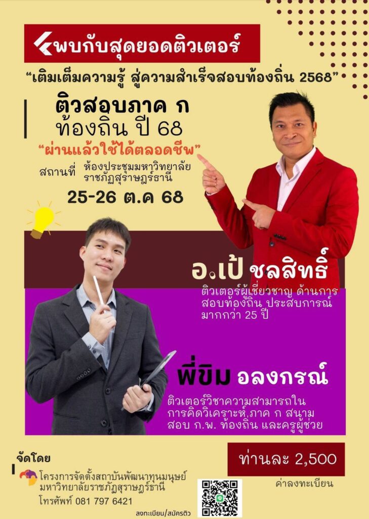 📣 มหาวิทยาลัยราชภัฏสุราษฎร์ธานี โดย โครงการจัดตั้งสถาบันพัฒนาทุนมนุษย์ ขอเชิญผู้สนใจเข้าร่วมโครงการติวเข้มสุดพิเศษ “ติวสอบภาค ก ท้องถิ่น ปี 68” “ผ่านแล้วใช้ได้ตลอดชีพ”